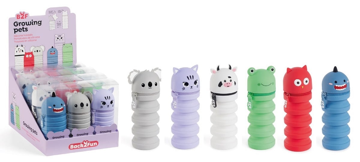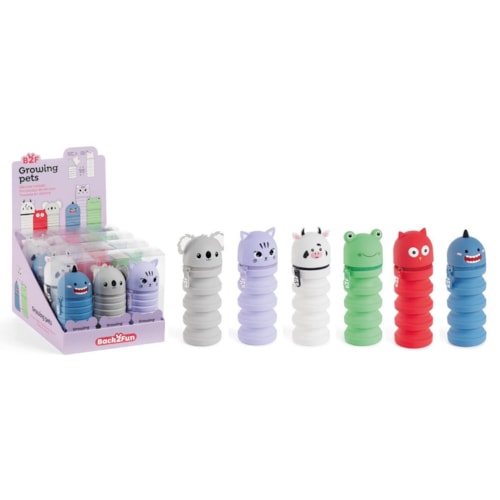 Cada display contém 16 estojos de tamanho 75 mm x 185 mm x 55 mm. 8 cores variadas: preto, rosa, rosa coral, mostarda, verde, cinza, azul celeste e azul royal.