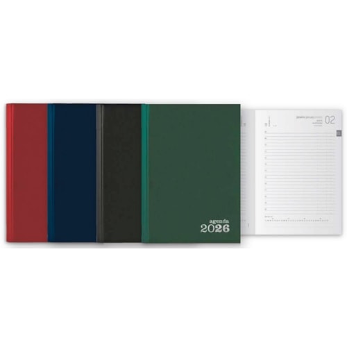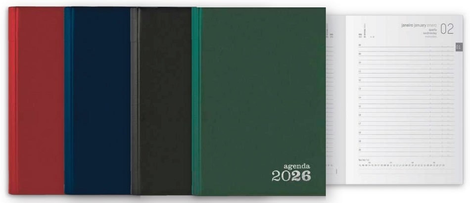 Agenda de secretária com um dia por página, Calendários, dados pessoais, feriados nacionais e festas móveis, feriados municipais, fases da lua, divisão administrativa de Lisboa e Porto, plano anual em curso e ano seguinte, telefones de utilidade pública e lista para contactos