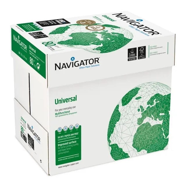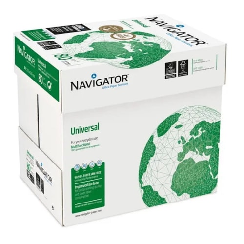 PAPEL NAVIGATOR UNIVERSAL 80 GRS 100% garantido em todos os equipamentos de escritório (fotocopiadora, impressora laser, jacto de tinta, fax). Desempenho inigualável. 99,9% livre de imperfeições. Grande versatilidade para o uso diário. Excelente qualidade de cópia e impressão. Ideal para aplicações em preto/branco e cor. Elevada onsistência de qualidade ao longo do tempo. Alta opacidade e resistência para aplicações em ambos os lados. Seca rápido e absorve correctamente a tinta. Protege o equipamento do seu escritório graças á superficie melhorada e à consequente menor abrasividade. Branco para sempre, ISO 9706, duração em arquivo mais de 200 anos. Preço sujeito a confirmaçao para entregas fora da área da grande Lisboa