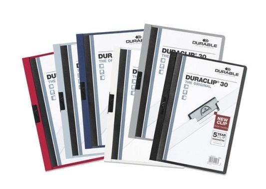 Classificador Durable PVC com clip, capa transparente, parte de trás colorida opaca, com ferragem de clip. Capacidade: 30 folhas.