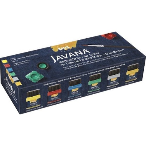 Conjunto contém: 6 tubos de Tinta Javana para têxteis nas cores amarelo solar, vermelho ruby, azul safira, verde esmeralda, prata e ouro.